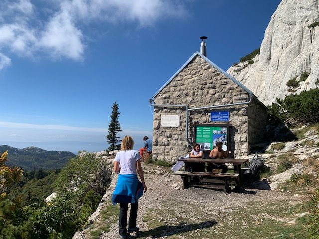 Kad smo prihvatili da ipak treba krenuti dalje, zapitao sam se kako još nismo naletili na Rossijevo sklonište, to je bilo nekako planirano kao prvo odmorište. Upitah susjeda na plandovalištu, a on će: “je li se šalite? Pa evo je pred vama!” Kamena kućica na 1580 m, sigurno je sklonište, kad vrijeme nije ovako naklonjeno kao nama. Pitao sam se kako ponijeti što manje, ali ipak sve što treba pa sam u zadnjem trenu odustao od drugih cipela i rezervnih hlača, a sad uživam u kratkim hlačama. Koliko je počela jesen na 1600 metara, vidit ćemo večeras. Sklonište je dobilo ime. po rođenom Senjaninu, Ljudevitu Rossiju, botaničaru i planinaru za kojeg kažu. kako je u proučavanju “cvjetane”, propješačio gotovo cijelu domovinu. Savršeno sklonište za noći ili teškog vremena, nama je poslužilo samo za slikanje, što kućice. što fenomenanog pogleda prema Rabu.
