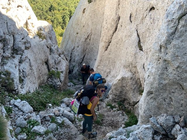 Ali nemamo vremena za plandovanje. Sklopili šatore, “auu” na leđa i put pod noge. Na tom malom komadiću civilizacije, sreli smo kombi “Dragec”(ne, nije mi ništa platio), koji je često nezaobilazan detalj u planiranju ruta na ovom dijelu Velebita, kao podrška za povezivanje cilja sa startom. Svaka im čast. Eto nas kod putokaza “Baške Oštarije 12 h”. Kako li se to računa? Koja brzina ispunjava normu? Neću nikad zaboraviti, jednom davno, Igor i ja smo s Ivinih Vodica krenuli prema Borisovom domu na Paklenici. To je cca. 2 i po sata standardnog planinarskog hoda. Kad smo već bili na 20-ak minuta od clja, sretosmo mladi par s malom mačkom, iz suprotnog smjera. Upitali oni nas koliko još ima do Ivinih Vodica pa ostali zaprepašteni našim odgovorom da je još malo više od dva sata. Zakukali su kako već hodaju 2 sata…