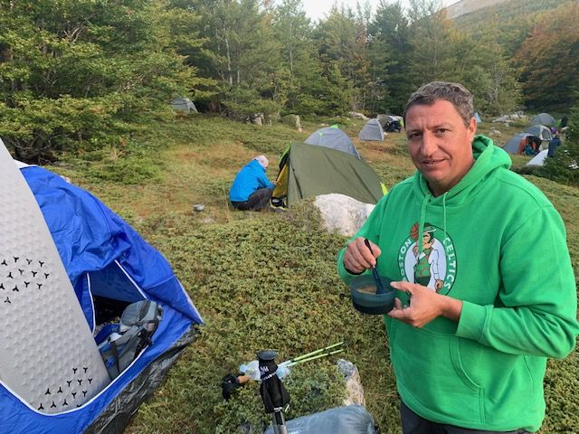 06:02 postajem svjestan, dodirujem oko sebe, sve je suho, osluškujem – ne pada kiša, možda je vrijeme za pakiranje. Očito po kiši možeš suh u šatoru mirovati😊, možeš pod kabanicom satima hodati, ali ono vrijeme između mi se čini najraniivije – pakiranje, spremanje ili kuhanje. Odmah smo se nas dva sporazumili kako je najbolje brzo se dobro spakirati, veeelike kabanice imati na najdohvatljivijem mjestu i krenuti sad, u zoru. Razdanjuje se, idealno vrijeme za popiti vruću kavu, ali nismo dovoljno hrabri po ovakvoj naoblaci sve raspakirati na milost i nemilost naglom pljusku.