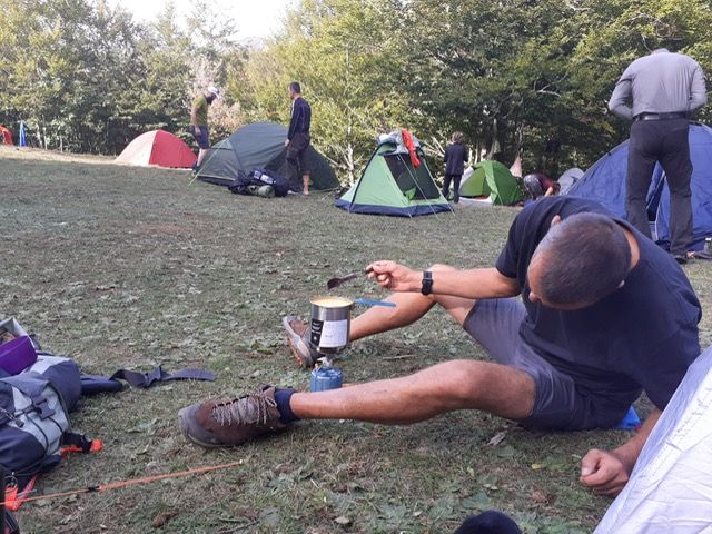 Znaš ono, kad si na kraju, onda ti je svaki korak viška kao 10. A došavši do planinarske kuće, osjetio sam kako nismo uopće nešto dobrodošli niti je domar ili tko je to već bio, pokazao volju ili smjer gdje nas je čekao “checkpoint”. Grozno je bilo tek spušteni ruksak ponovno nagrbiti pa nastaviti koračati nekih 200-tinjak metara do druge kućice. Tu nas je čekala klupa, voda, hrana, ali najljepše od svega, veliki osmjeh cure koja nam je udarila pečate u knjižice i poslala nas na fažol. Natrpaše nam fažola iz velike kace iz koje se pušilo i fino davalo kako to već daje kad se takva spiza sprema za veliku ekipu. Brzo pojedosmo jer, ako nas je toliko puno, bilo bi dobro pronaći mjesto za šator pred navalu glavnine ekipe. Obzirom da smo jos uvijek unutar Nacionalnog parka Sjeverni Velebit, zabranjeno je i kampiranje van propisanog mjesta pa nas je dopala padina ponad strojarnice nekadašnje žičare, što je spuštala debla smreke, jele i bukve, dole do uvale Stinica. Obzirom da je proradila 1959, mozete pretpostaviti koliko je nesretnika s Golog otoka ovdje ostavilo svoje najbolje godine. Što je najluđe, kažu da žičara nije radila ukupno više od godine dana jer su zaboravili da je ovdje neprikosnoveni vladar bura.